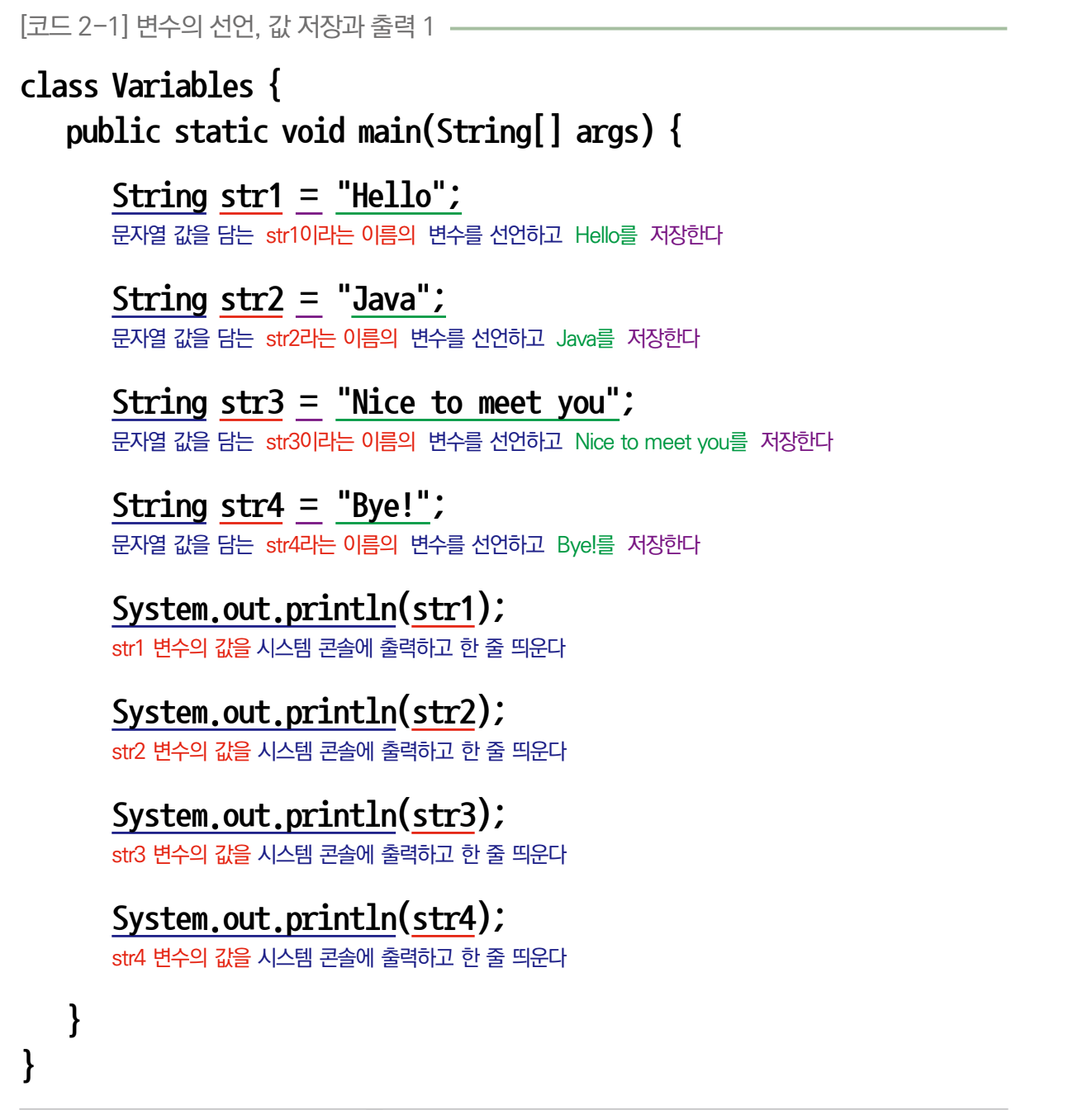 이번 장에서 공부한 변수를 바탕으로 [코드 2-1]을 분석해 보면 문자열 값을 담는 String 변수 4개에 값을 대입하고 이 값을 출력하고 있습니다. ‘Variables’라는 클래스 이름을 가진 새로운 클래스를 생성하여 [코드 2-1]을 작성해 봅시다.