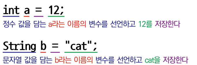 메모리 공간에 해당 변수를 저장할 공간을 만드는 것을 ‘변수를 선언한다’라고 합니다. 변수를 선언할 때는 (1) 해당 변수가 어떤 타입의 데이터를 담을 것인지 명시하고 (2) 변수의 이름을 적은 후 (3) ‘;’으로 변수 선언이 끝났다는 걸 표시합니다. 프로그래밍 언어에서 세미콜론(;)은 문장의 끝에 찍는 문장의 마침표(.)와 같다고 생각하면 됩니다.